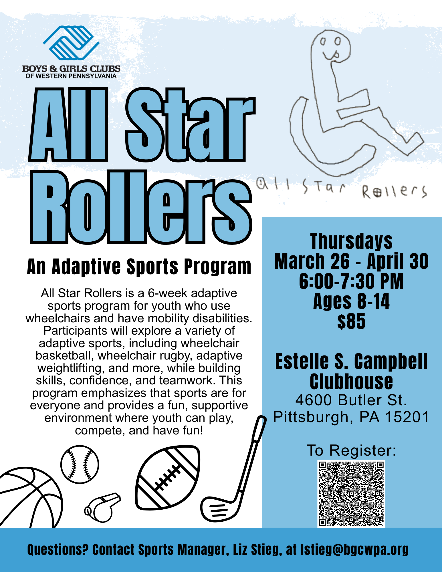The Boys and Girls Club of Western PA is hosting an adaptive sports program for athletes that use wheeled mobility this spring! This is an opportunity for athletes to learn about and explore several different sports. The flyer is below, and you can register using the QR code or by going directly to the